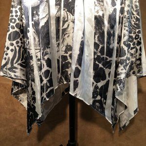 Silky Smooth . Umpire elastic waistline. Handkerchief hem. Bat-wing elbow length sleeves. Can be worn with sandals for a more casual look.
