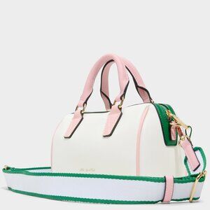 Candy-pink handles and playful doodles stitch weekend energy into this leather barrel, while a detachable web strap morphs from grab-and-go top-handle to laid-back cross-body in seconds, so cafe runs feel effortless and weekend escapes sparkle. Pair it with a sundress for sunny cafe dates or clip on the long strap with joggers for travel days to finish the vibe.