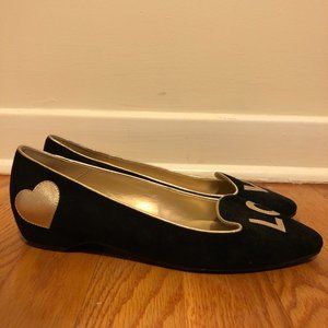 It doesn't get any cuter than this! Black suede flat made by Town Shoes. Shoes spell out LOVE, with adorable gold heart detailing on the exterior of both shoes and gold trim. Leather upper. Little heel. Shoes no longer have the price tag but are new and have never been worn.
