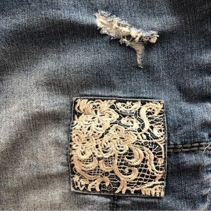 Love Indigo Midrise Jeans. Fun trendy distressed embroidered embellished cropped leg jean. Excellent condition, they fit oversized Size 12 or a snugger Size 14. Accommodates larger hips & thighs.