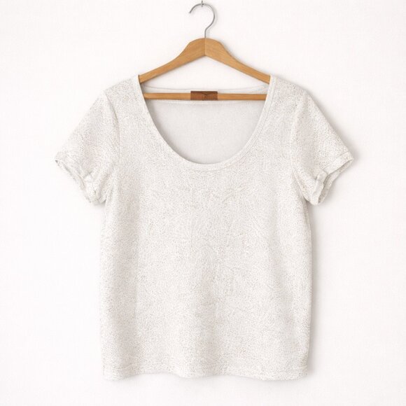✨ A festive and flattering white tee with gold sparkle shimmer, perfect for holiday outfits, parties, or adding a little glam to everyday wear. Soft, comfortable, and easy to style with jeans, skirts, or layered under a blazer.