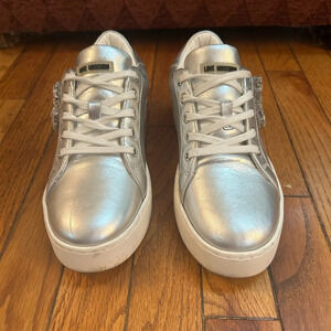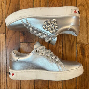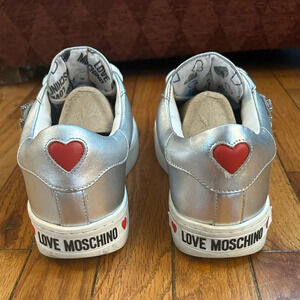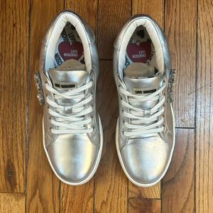 LOVE MOSCHINO Heart Encrusted Silver Leather Sneakers, size 38