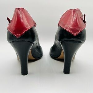 The bold red and black color combination adds a touch of drama to any outfit, while the heart shape detail on the front adds a playful yet sophisticated touch. Made from high-quality leather, these pumps are both stylish and durable, ensuring long-lasting comfort and wear.