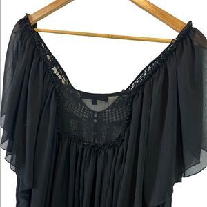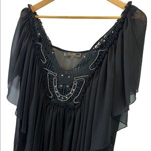 LOVE STITCH Black Flowy Embellished Deep Ab Flutter Sleeve Loose Fit Top S