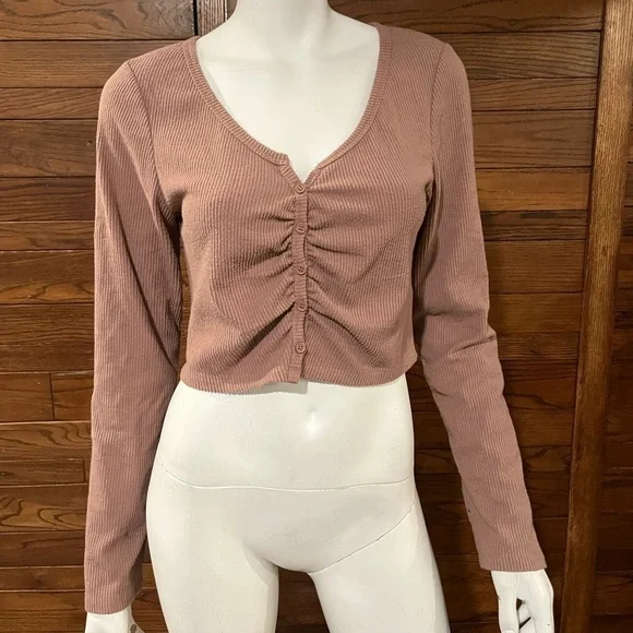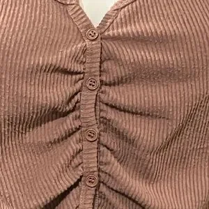 LOVE Tree. Ribbed. Crop top. Tan. Button up. Scoop neck. Rousching.