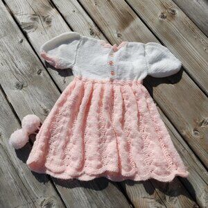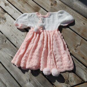 LOVELY Crochet Baby Dress with Pom Pom Detail White Pink 0-3 months