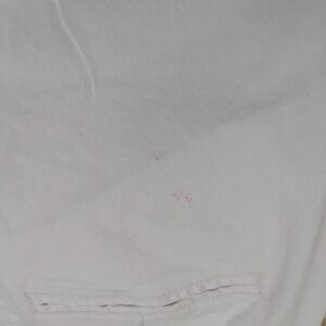 Small pink mark on the back underneath the left back pocket. The back pockets are faux pockets.