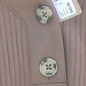 This olive green top has a beautiful neck line and 5 tortoise buttons.