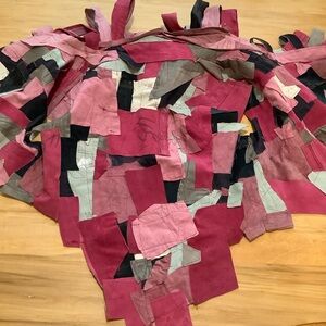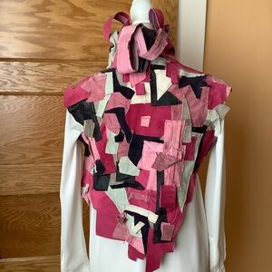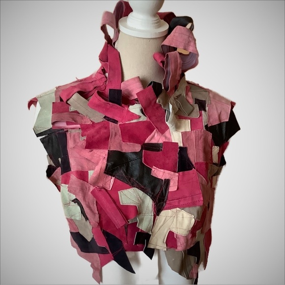 NWOT From couture fashion designer, Matthew Donnelly, comes a multi-hued pink vest in a one-of-a-kind suede and leather patchwork design. Exposed suede and leather loops throughout offer a artsy-cool vibe to this amazing custom piece. Add a touch of drama to any outfit with this one-of-a-kind piece of wearable art.