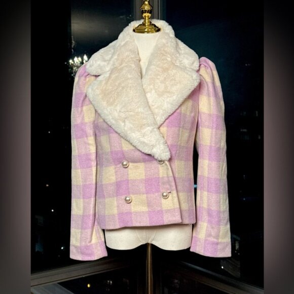 LoveShackFancy's plaid 'Dumont' jacket is designed with dramatic faux fur notched lapels which calls to mind vintage styles from the '50s. Woven with lavender and ecru