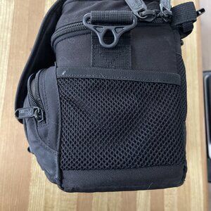 Bag looks to be in perfect shape. Only issue I can find is the strap is attached to looks on corners of bag instead of strap fasteners. Could use a different strap maybe, or use it just the way it is. Rain over stows in bottom part of bag. All pictured.