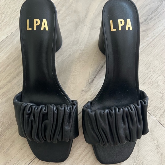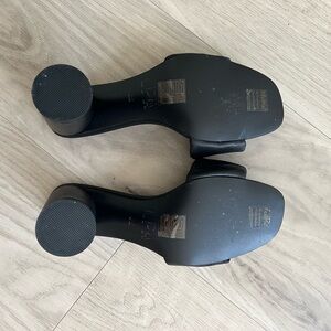 Elegant black mules with ruffled design. Perfect for stylish outings.