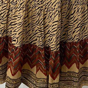 This LRL Lauren Jeans Co. by Ralph Lauren 100% cotton animal print skirt in size Large features a trendy layered design and a full skirt silhouette that adds movement and flair. Its fun, feminine style makes it a versatile piece perfect for elevating your wardrobe with a bold yet elegant touch. It includes a plain base layer for extra fullness and to prevent any show-through.