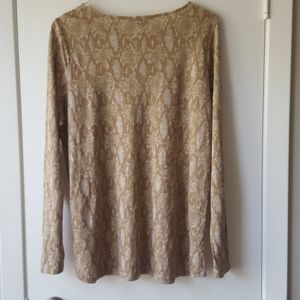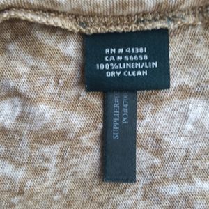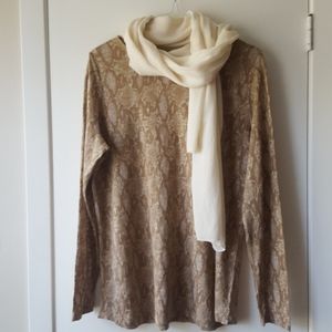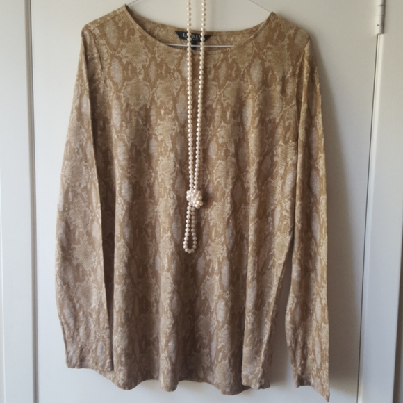 A pale python print defines the eye catching allure of this lightweight linen knit top. It has ballet neck, slightly curved hem and long sleeves.