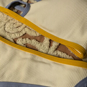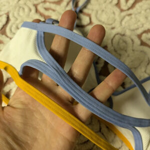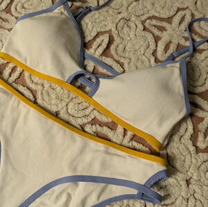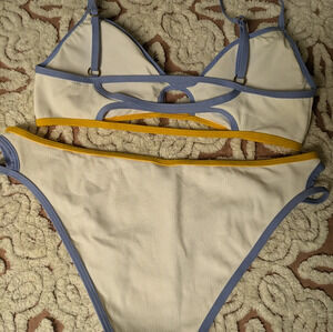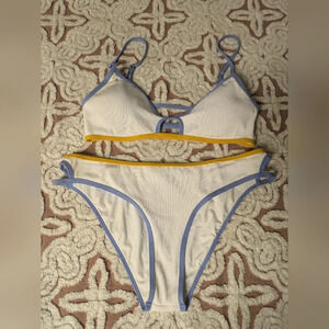 Stylish bikini with a white base and yellow accents. Features cut-out details. Perfect for beach days.