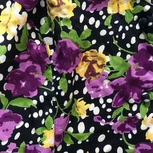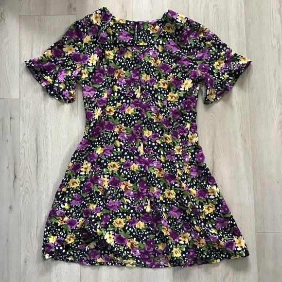 Gorgeous mini dress in a floral and polka dot pattern. Retro silhouette with short flutter sleeves, a flared skirt and matching fabric buttons down the front of the dress. Light and flowy with flattering front seams. Bought at The Hudson’s Bay.