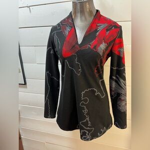 Striking Luc Fontaine long-sleeve top featuring an artistic abstract print in red, grey, and black tones. Deep V neckline and fitted silhouette that enhances the figure. A bold yet elegant piece that pairs beautifully with both jeans or tailored pants.