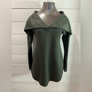 Unique and stylish forest green tunic by Luc Fontaine, featuring a wide collar with snap buttons and grommet details. The collar can be worn open or buttoned for different looks. Soft mixed textures on the sleeves and collar give it a modern, cozy twist. Perfect with leggings or jeans.