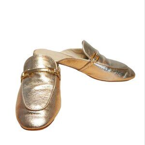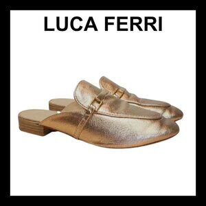 LUCA FERRI Rose gold, all man made, block 0.5" heels, mules, size 7. Great pre-loved condition, little bit of creases but otherwise no major flaws!