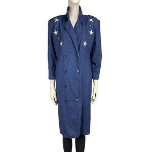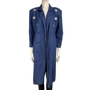 LUCILLE FAUCHER VTG 80’s 90’s Denim Trench Coat Midi Jacket Studded Embroided 10