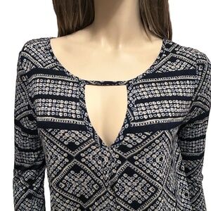 LUCKY BRAND Geometric Boho Blouse Top Shirt Plunge V-Neck Cutout Keyhole Rayon