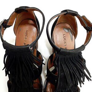 LUCKY BRAND Leesha Fringe T-strap Sandals with Block Heel in Black Suede Leather