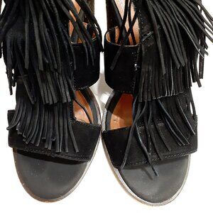 Fun & flirty fringe leather sandals with t-strap and chunky block heels from Lucky Brand. Super comfortable cross-strap, holds the foot in place very well. In fair condition with signs of wear. Some damage is on the inside of the heels due to the insoles I wore with these. Bottom sole is rubber and non-slip. Wood grain effect on the block heels.