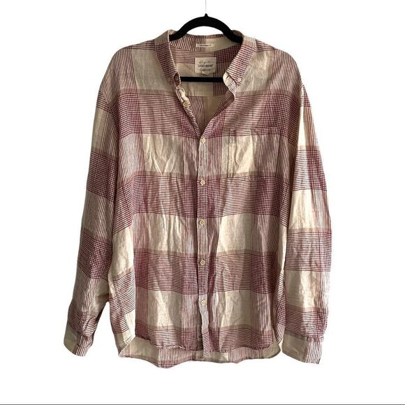 LUCKY BRAND Men’s Plaid Cotton Linen Button Front Shirt Red Tan XL