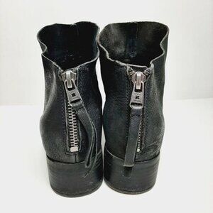 • Low chunky heel almond toe , genuine leather ankle boots in black with back zipper closure