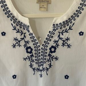 Elegant white top with intricate blue embroidery. Perfect for a stylish and comfortable look. Lined only in the front chest panel! Would compliment a boho, western or peasant look!