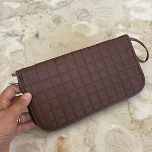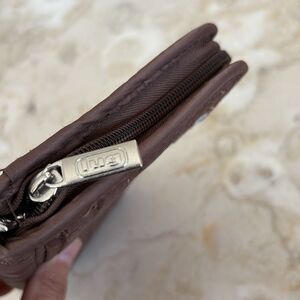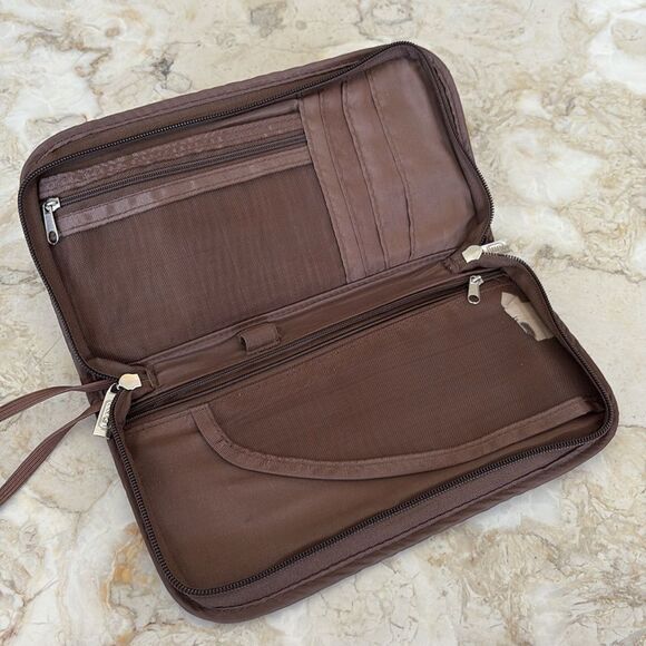 In excellent preowned condition convenient Lug Tango travel wallet. Handy and large enough to hold passport, travel documents, credit cards, ID, and cash with two way zipper, one exterior slip pocket, plus two zippered compartments, 4 credit card slots, a slip pocket and a pen holder.