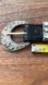 Luisacchi fancy belt is made in Canada of genuine leather. Shiny black with a textured brass tone buckle embellished with 6 rhinestones and 3 rhinestones on the metal keeper. stamped 05086A. Wear this with your jeans or over a sweater or jacket.