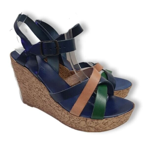 • Summer faux cork lightweight wedge sandals, women's shoes with navy leather, green and tan leather straps.