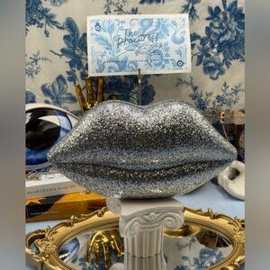 🆕 LULU GUINNESS 🧿 NWOT Silver Glitter Iconic Lips Perspex Clutch on a Chain