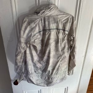 A super cute and unique printed jacket from Lulu Lemon. It is packable and it also has a packable hood. It features reflective section making it a great peice for outdoor use.