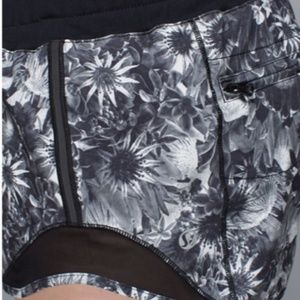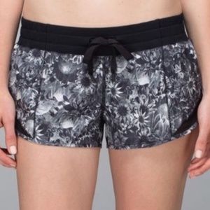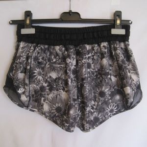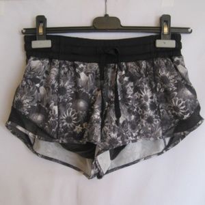 Lulu Lemon low rise shorts. Color: Flowabunga Black Angel Wing/Black. SIZE: 4. Swift ultra fabric has four-way stretch, mesh fabric panels for ventilation. Secure zip back pocket. drawstring waist, reflective details, light Luxtreme liner. Fabric Content: Body: 86% polyester,14% spandex, Contrast1: 87% nylon,13% lycra spandex,Contrast 2: 87% nylon,13% spandex,Lining: 89% polyester,11% lycra spandex, Lining 2:91% nylon,9% spandex.Shorts are in good condition. Gently worn, no stains, rips or snags.