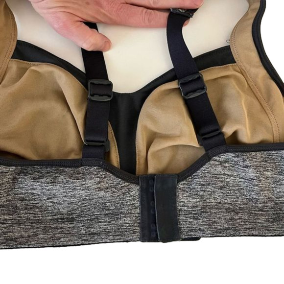 Lululemon Athletica Ta Ta Tamer Bra in medium heathered grey with charcoal grey mesh and trim.