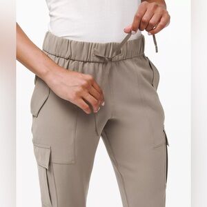 Comfortable tan LULULEMON cargo pants with an adjustable drawstring waist. Designed with multiple pockets for everyday functionality. Straight-leg silhouette that pairs well with casual tops and sneakers.