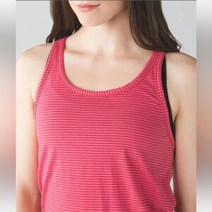 • Turn up the heat or cool it down in this soft, versatile racerback tank • Like new condition this tank in Pima cotton with no flaws • Red and pink striped pattern • Four way stretch and rounded hem • No size tag - approximately size 6-8 • Pit to pit: 17” • Length: 26”
