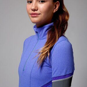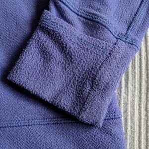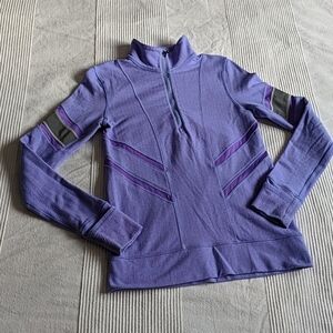 Ivivva Glow and Go 1/2 zip pullover with reflective arm bands (see pics with flash) and zipper. Lovely lilac colour. Good pre-owned condition. There is some pilling and signs of regular wear on the inside/outer thumbhole/cuff area - please see pics. Still lots of life in this piece!