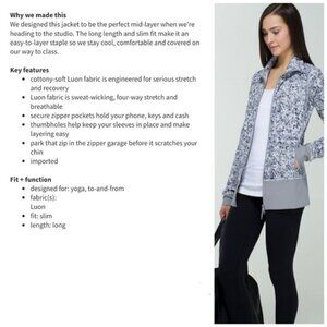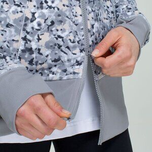 Lululemon Nice Asana jacket in Not So Petite Fleur Silver Spoon/Silver Spoon/Ambient Grey is in very good, pre-owned condition. The long length and slim fit make it an easy-to-layer staple so we stay cool, comfortable and covered on our way to class. Cottony-soft Luon fabric is engineered for serious stretch and recovery. Secure zipper pockets hold your phone, and thumb holes.