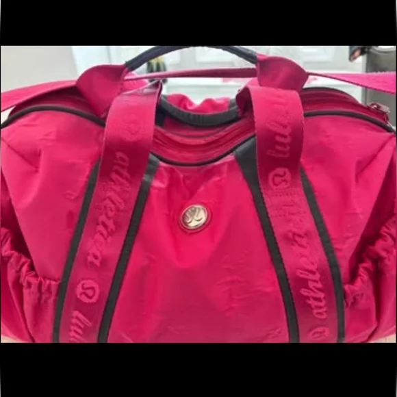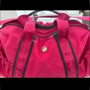 Rare Lululemon Duffle Bag Pink Large Strap with logo handles and a crossbody strap. This item is sold AS IS, it is vintage and previously loved so there are signs of wear as per the photos. However, the inside of the bag is in excellent condition.