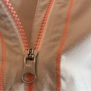 Lululemon Beach Run Jacket. Full front zipper closure and two front zipper pockets. Size 4. Size dot confirmation. The color is Dune/Bleached Coral/White.