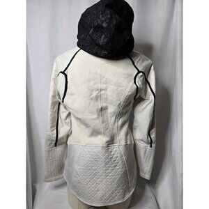Good used condition with some wear. In well loved condition. Lots of life left! The color is an off-white cream. The coat was soaked in oxy clean white revive to remove stains, but there are still some minor stains and discoloration present on the sleeves and jacket.