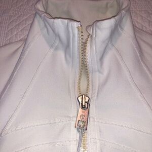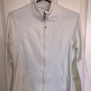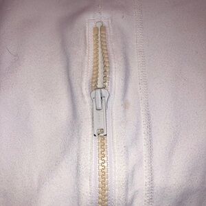 LULULEMON white front zip jacket with two side zipped pockets and thumb hole/mitten sleeves. Good condition but zipper has yellowed a bit. Stretch fabric. Size 10