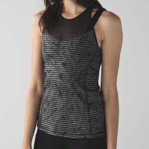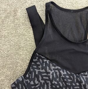 Bra area lined with openings for bra cup liners (no liners with these but easy to replace). This top is very fitted and fits like a size 2. No flaws. Hard to find! Black and gray.