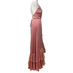 LULUS IN LOVE FOREVER ROSE PINK SATIN LACE-UP HIGH LOW RUFFLE FORMAL DRESS - STYLE AD 1988L, Lulus Exclusive! Once you fall for the Lulus In Love Forever Rose Pink Satin Lace-Up High-Low Maxi Dress, you'll always be in love! Sleek woven satin dances across a surplice neckline with elegant princess seams. A set of crisscrossing adjustable straps top off the alluring lace-up back. A wrapped maxi skirt stuns with a double tier of flouncy ruffles before falling to a high-low hem. Hidden back zipper/clasp. - Lined - Fit: This garment fits true to size.