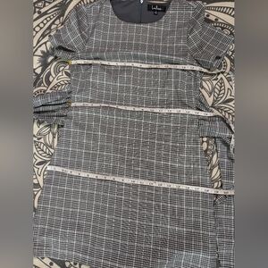 Meet us in the quad in the Lulus Penny Black and White Gingham Knotted Sheath Dress! Medium-weight woven fabric, in a black and white gingham, creates a rounded neckline, short sleeves, and darted bodice. Waist sash ties above a flirty sheath silhouette. Hidden back zipper. Lined. In excellent condition.