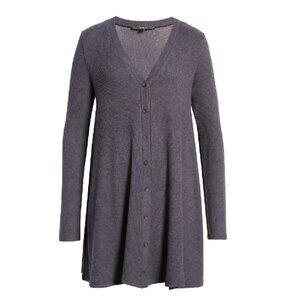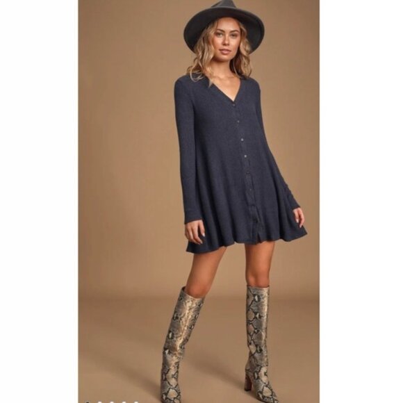 Super soft and lightweight ribbed knit shapes this swingy sweater dress that serves cute and cozy in equal measure.
