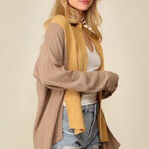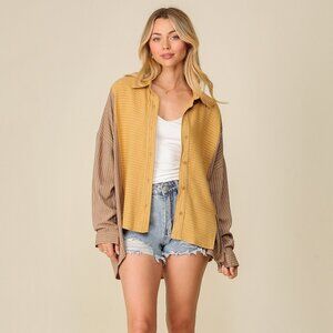 striped shacket, color block shirt, oversized button-up, casual streetwear top, mustard yellow shirt, taupe brown striped blouse, layering piece, trendy oversized shirt, long sleeve top, lightweight fall shirt